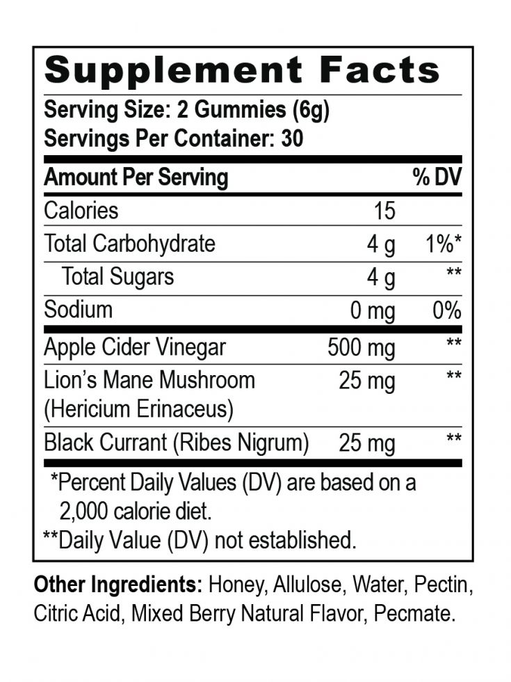 Ingredients: Apple Cider Vinegar, Lion’s Mane Mushroom, Black Currant, Honey, Allulose, Water, Pectin, Citric Acid, Mixed Berry Natural Flavor, Pecmate.