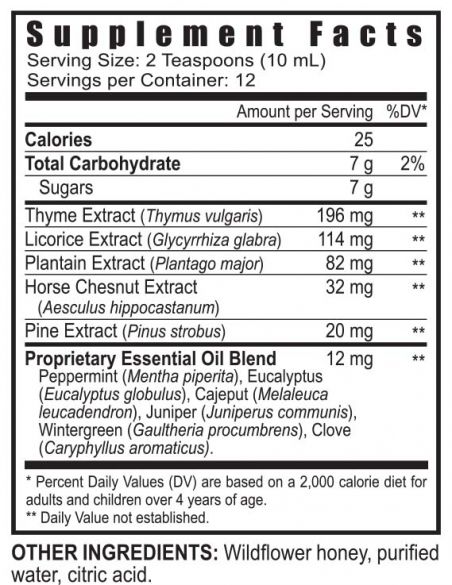 Ingredients: Thyme Extract, Licorice Extract, Plantain Extract, Horse Chesnut Extract, Pine Extract, Proprietary Essential Oil Blend [Peppermint (Mentha piperita), Eucalyptus (Eucalyptus globulus), Cajeput (Melalueca leucadendron), Juniper (Juniperus communis), Wintergreen (Gautlheria procumbrens), Clove (Caryphyllus aromaticus)], wildflower honey, purified water, citric acid.
