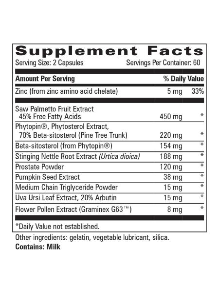 As men age, prostate and urinary health become more of an issue. A large percent of men over the age of 40 suffer from an enlarging prostate. This can make urination difficult or increase its frequency. While benign in nature, an enlarged prostate can affect comfort and quality of life. This unique formulation helps maintain a healthy prostate and promote normal urinary function.* Ingredients: Zinc (from zink proteinate), Saw Palmetto Extract (fruit) 45% Free Fatty Acids, Phytopin®, Phytosterol Extract, 70% Beta-sitosterol (Pine Tree Trunk), Beta-sitosterol (from Phytopin®), Stinging Nettle 5:1 Extract (Urtica dioica) (root), Prostate Powder (porcine), African Pygeum Extract (bark), Pumpkin Seed, Medium Chain Triglyceride Powder, Uva Ursi Extract, 20% Arbutin (leaves), Flower Pollen 20:1 Extract (Graminex G63™), gelatin, vegetable magnesium stearate, silica.