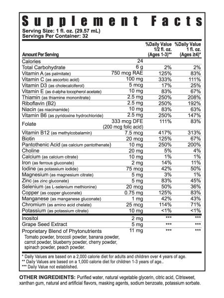 Vitamin A, Vitamin C, Vitamin D-3, Vitamin E, Vitamin B-1, Vitamin B-2, Vitamin B-3, Vitamin B-6, Folate, Vitamin B-12, Biotin, Pantothenic Acid, Calcium, Iron, Iodine, Magnesium, Zinc, Selenium, Copper, Manganese, Chromium, Potassium, Choline, Inositol, Grape Seed Extract, Broccoli Powder, Banana Powder, Carrot Powder, Blueberry Powder, Super Sweet Corn Powder, Cherry Powder, Spinach Powder, Peach Powder, Tomato Powder, Purified water, natural vegetable glycerine, fructose, citric acid, sweetener, natural flavor, xanthan gum, potassium sorbate, sodium benzoate (to preserve freshness).
