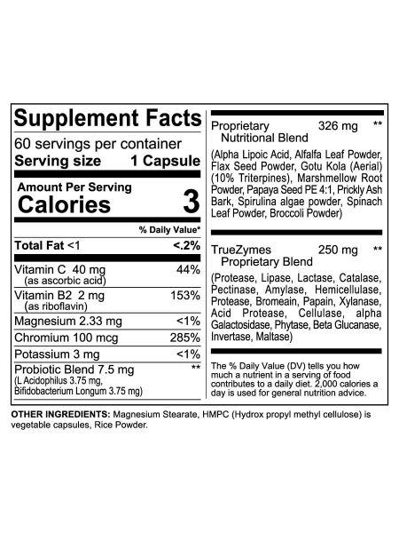 Vitamin C, Vitamin B2, Magnesium, Chromium, Potassium, TrueZyme Proprietary Blend, Probiotic Blend, (L Acidophilus, Bifidobacterium Longum), (Alpha lipoic acid, broccoli, marshmallow, papaya, prickly ash, gotu-kola, spirulina, alfalfa powder, flax seed powder, spinach), Magnesium Stearate, Vegetable capsules (HPMC), Rice Powder.
