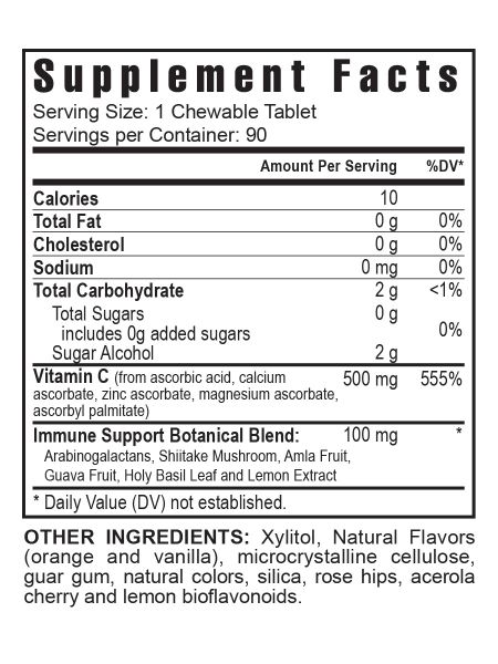 What sets this product apart? The Vitamin C Chewable delivers the daily recommended dose of vitamin C necessary essential functions within the body plus a proprietary blend of immune boosting botanicals to support a healthy immune system.